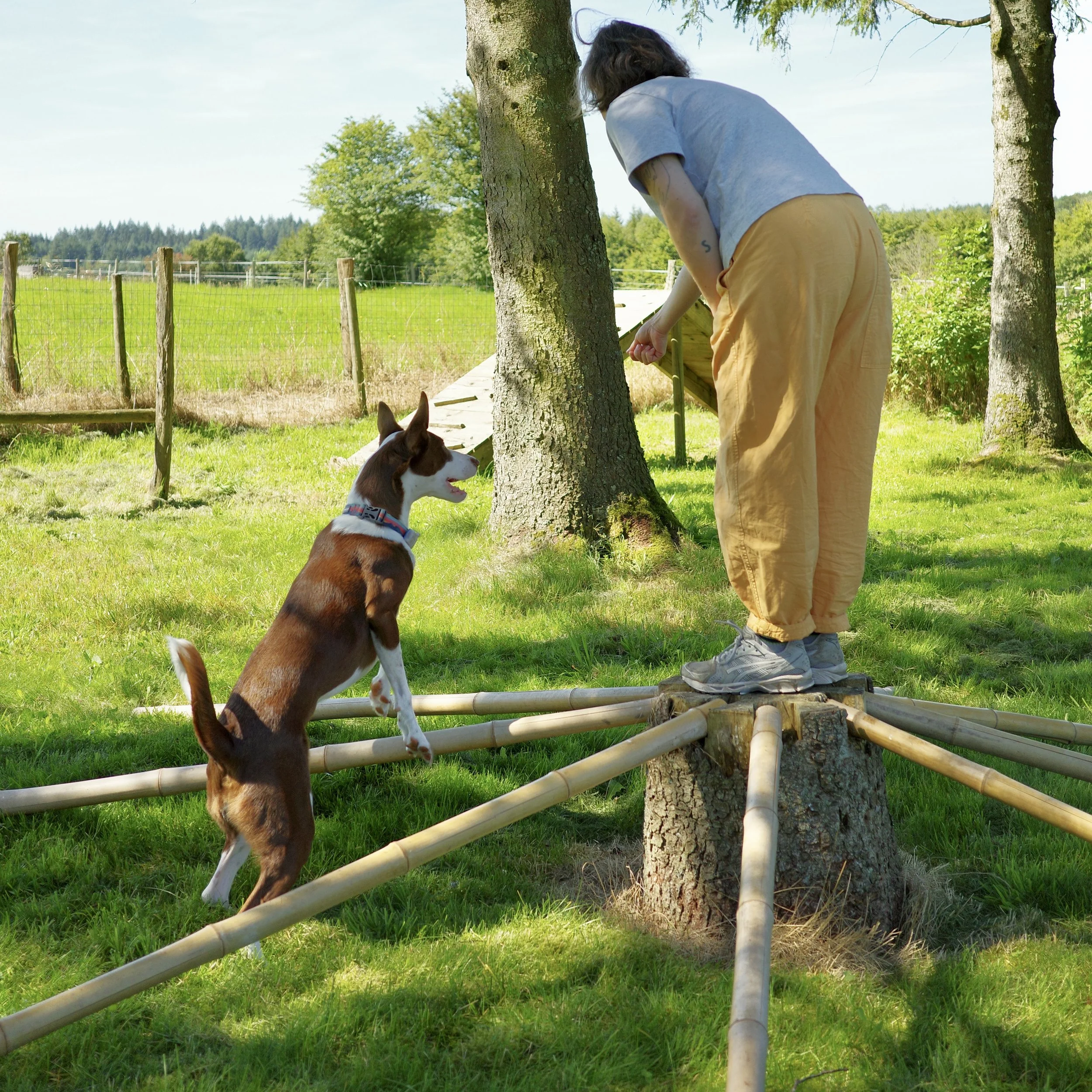 NINJA DOG PARKOUR . Voor deze workshop hebben wij ons hele trainingsbos omgebouwd tot een avontuurlijk hindernissenterrein met uitdagingen voor kleine én grote honden. Voor wie graag iets actiefs doet, waarbij de hond centraal staat! Ons trainingsbos kreeg al veel aandacht uit binnen- en buitenland en zal je verbluft doen staan! Kies voor een halve dag privé-begeleiding (ideaal voor honden die het moeilijk hebben met interacties of aanwezigheid van andere honden, of omdat je gewoon graag eens iets helemaal alleen met je hond wil doen), of je schrijft in met maximaal drie vrienden/familileden en maximum 4 honden. Dan krijg je een hele dag les, inclusief een heerlijke uitgebreide lunch.